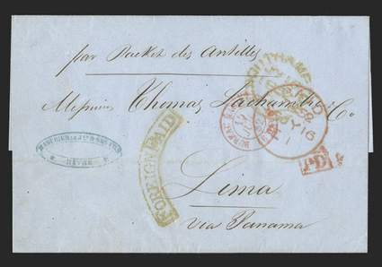 London transit backstamp and boxed Colonies&cc. Art 13 handstamp,Lima, Peru to Bordeaux, folded letter with bold strike of British Post Office red double arc "Panama/Au 22, 1846" datestamp without index letter on reverse (repeated on front), London transit backstamp and boxed "Colonies/&cc. Art 13" handstamp, red Boulougne entry datestamp and "20" decimes due, Bordeaux backstamp, fresh and very fine; the circular date stamp in red with no index letter is quite difficult to find. (Image) Est. $150-200