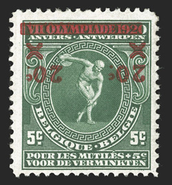 inexplicable reason, Scott has deleted the listing for the 10c value with#140a-142a, 1921 "20c" Surcharge on 5c+5c to 15c+15c Olympic games semi-postals, inverted surcharges cplt., o.g., lightly hinged, fine and scarce set; 10c signed; for some inexplicable reason, Scott has deleted the listing for the 10c value with inverted surcharge, so we have cataloged it at $625.00, the same as the other two values. (imagea) (imageb) (Image) $1,875.00
