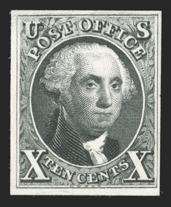 fine.#2TC1, 10c Washington, large die trial color proof in Dark green on India, 51x64mm die sunk with cross-hatching, bright color, shallow thin at top, otherwise extremely fine. (Image) $1,000.00