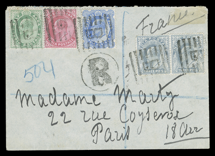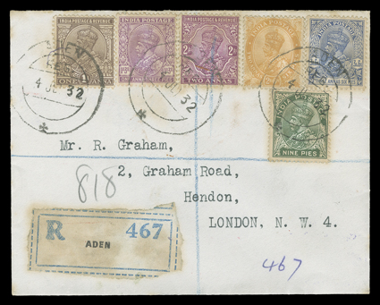Victoria and Edward VII ½a and 1a stamps, comprised of five covers mailed prStreet correspondence covers and the Aden-Yemini Boundary Commission and Somaliland Field Force, ten covers to Farnborough, England from 1902-04 franked by various India Victoria and Edward VII ½a and 1a stamps, comprised of five covers mailed prior to the Boundary Commission from Nowshera, Dilkusha (2) and Fizabad (2), India between January and December 1902, three covers mailed from Dthali, Yemen between March 4th and April 9th 1903, two of which are endorsed by Street as from "1st Hants Regt./Arabia" and cancelled at Aden (Street was attached to "G" Company, which had been around Dthali on maneuver against the Kataibis since October 1902), and two covers sent from Somaliland in 1904, one with India 1a Victoria tied by Berbera datestamp, generally fine-very fine; accompanied by Robson Lowe monograph on the subject. (Image) Est. $500-750