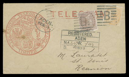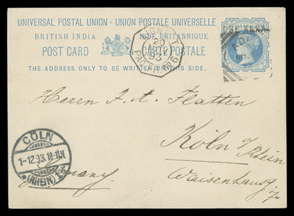 3263 c   India used in Aden covers and cards group of 42 items ranging from Queen Victoria to George V, best is an 1856 4a Black tied to 1861 cover to Aden, the rest mostly post 1890 usages on covers, postal stationery and picture post cards, with a nice variety of frankings and destinations including Italy, Reunion, Russia, Trieste and Zanzibar and a few registered, some faults, most fine-very fine. (imagea) (imageb) (imagec) (imaged) (imagee) (imagef) Est. $1,000-1,500