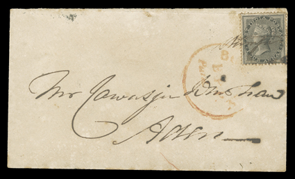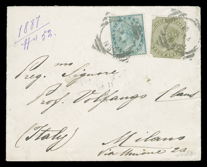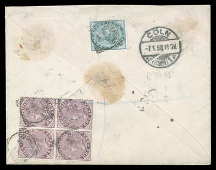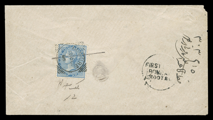 postage due, the other four all franked by 1869 1a Lilac (Barefoot RecRevenue stamps used as postage, five covers, one fraudulently franked by previously used 1868 4a Green (Barefoot Special Adhesive #16) tied to 1885 cover to London and charged postage due, the other four all franked by 1869 1a Lilac (Barefoot Receipt #5-6), one sent from Karachi Camp to London while stamps were not available, the other three domestic usages, all charge postage due, several faults, otherwise fine-very fine; first accompanied by 2006 BPA certificate. (Image) Est. $300-400