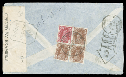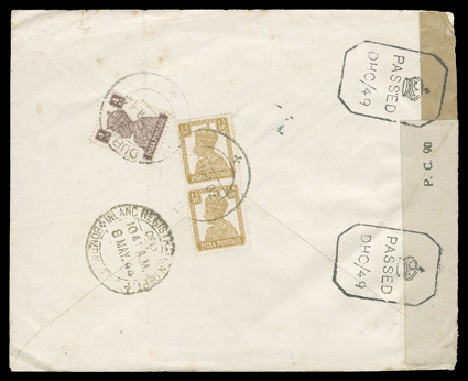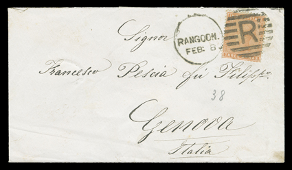 3265 c   India used in Burma covers and cards group of 45 items ranging from East India Co. issues to George V showing a variety of frankings and towns of origin as well as a variety of destinations including Bahamas, Ceylon, Italy and Switzerland, one from Moulmein with 1856 4a Black with red boxed "Rangoon Ship Letter" backstamp, also includes a 1943 map of Burma, some faults, most fine-very fine. (imagea) (imageb) (imagec) (imaged) Est. $500-750