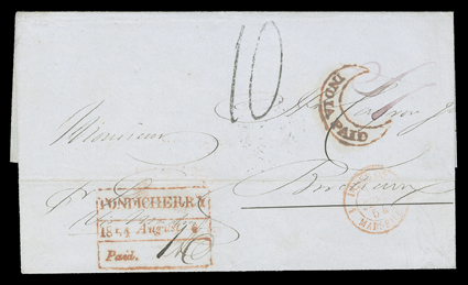 3266 c   India used in French India covers, nice group of 29 virtually all 19th century covers, nine being stampless covers to France, the others mostly franked by ½a Blue cancelled at Pondicherry to Indian destinations, except several others to France or England, one a partial cover with a three-color franking, generally fine-very fine. (imagea) (imageb) (imagec) (imaged) (imagee) Est. $500-750