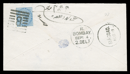 3270 c   India used from Malaya small group of eight covers and one card mostly from Penang but also a couple from Singapore, the best being three Smith correspondence covers from Penang to England franked by three or four 1856 4a Black, some faults, most fine-very fine. (imagea) (imagec) Est. $500-750
