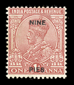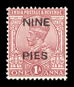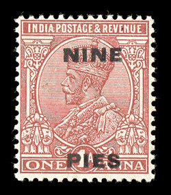 3094 p SG 192c S.G. 192c, 1921 NINEPIES surcharge on 1a Rose carmine, double surcharge, tied to small piece by neat town cancel, very fine signed Jal Cooper.S.G. #192c, 1921 "NINE/PIES" surcharge on 1a Rose carmine, double surcharge, tied to small piece by neat town cancel, very fine; signed Jal Cooper. (Image) £250
