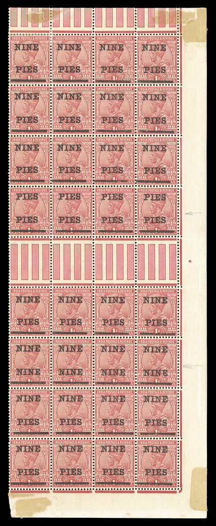 3092 nhbl SG 192a, 192b S.G. #192a, 192b, 1921 "NINE/PIES" surcharge on 1a Rose-carmine, errors "NINE/NINE" and "PIES/PIES", right sheet-margin mint block of 32 (4x8) with horizontal gutter, being the right four vertical rows from the sheet, the fourth horizontal row showing the "PIES/PIES" error and the sixth horizontal row showing the "NINE/NINE" error, the other stamps normal, well centered, o.g., h.r.'s on the face of the selvage and on the top left pair, other stamps all n.h., horizontal crease through the gutter, very fine; a scarce and attractive multiple; cataloged as hinged error singles. (Image) £640+