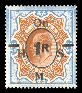 value would indicate 1969 BPA certificate.S.G. #O107a, 1926 "Service/One Anna" surcharge on 1a chocolate in error, bottom sheet-margin mint single, o.g., light h.r., very fine; scarcer than its relatively modest catalog value would indicate; 1969 BPA certificate. (Image) £190