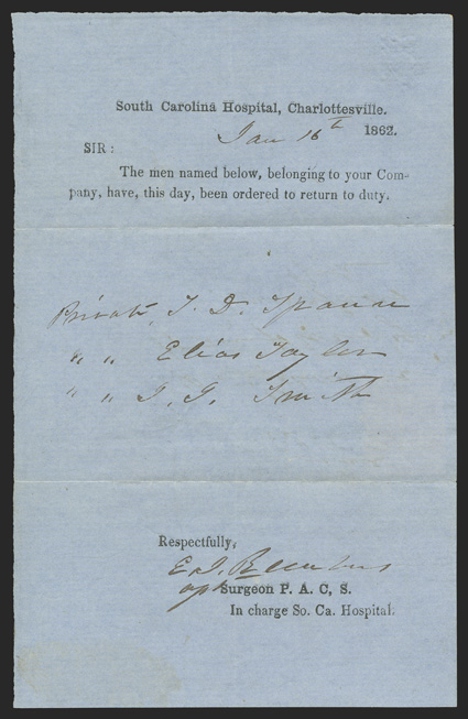 hospital notice addressed to Captain of Hamptons Legion, Manassas#1, 5c Green, single with irregular margins tied by blue target with matching Charlottesville, Va. c.d.s. at left on 1862 South Carolina Hospital "Return to Duty" part-printed hospital notice addressed to Captain of Hampton's Legion, Manassas, Va., endorsed "Official" with surgeon's initials at top, fine; a very rare and unusual usage; 2009 PF certificate. (imagea) (Image) Est. $750-1,000