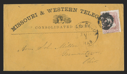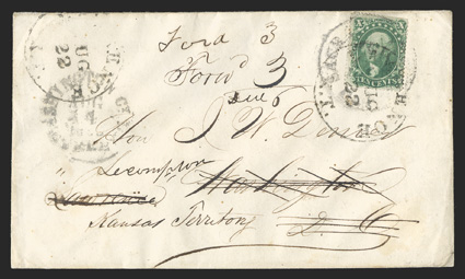 Clinton and Marion (both ex-Jarrett), also Osawatomie (with ms. note caKansas postal history collection consisting of approximately 500 covers, from territorial to early 20th Century, much of the value in territorials, with scarce towns such as Clinton and Marion (both ex-Jarrett), also Osawatomie (with ms. note "care Kit Karson"), plus there is a large specialized group of Lawrence, which includes a balloon datestamp of Jan. 12 (possibly an earliest known usage), one to Canada, plus various illustrated and unusual usages, typical mixed condition with mostly fine or better appearance; a nice representation that could form the basis of an exhibition quality collection of this interesting state. (imagea) (imageb) (imagec) (imaged) (imagee) (imagef) (imageg) (imageh) (Image) Est. $3,000-4,000