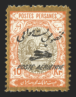 744 R 484/498 var., 560/577 var #484/498 var., 560/577 var., 1911-13 Ahmad Shah Qajar and 1915 Coronation of Shah Ahmed, Centers Inverted, an interesting accumulation of 29 singles, three strips of four or six and two complete sheets of fifty each, all with inverted centers, and all are reprints as is typical, largely all different and all are mint except one used, the sheets are of the 3c and 9c Coronation issue and in addition to having inverted centers they are also printed on both sides, couple of trivial flaws, mostly o.g. (the sheets are without gum), fine-very fine. Est. $400-500