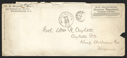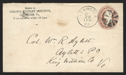 During the Civil War, the scarceness of basic resources led to creative methods of making envelopes. This was particularly true in the South, where envelope manufacturers used wallpaper, which was in relatively plentiful supply, when their normal paper stock ran out. In the case here, the soldier had just finished fighting in "The Seven Day Battles" and wanted to write home to his mother. Not having the normal paper and envelope material available, he took a paper shirt collar, wrote the letter in pencil on the inside, then addressed and affixed the stamps on the outside. It was accepted in the postal system and delivered to his mother in Philadelphia. The letter, datelined "Headquarters 2nd Regiment Banks James River Jul 4, 1862" mentions the battles "Dear Mother, We have fought five battles and won five victories. They took place on the 26th, 27th, 30th and 1st & 3rd...", also talks about Generals McCall and Reynolds being taken prisoner, and various officers being killed or wounded. Toward the end he notes "We have been driven from the rights to the left of our line, which has been completely broken up, but our confidence in McClellan is such that we believe it to be a great strategic movement and expect to enter Richmond soon in triumph..."