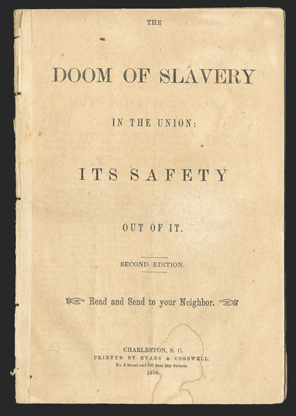 Cogswell, 1860. 8vo, 39 pages, printed wraps, with Constitution of 1Secession Booklets Choice pair of paper-wrapped Books, "The Doom of Slavery in the Union: Its Safety out of It," [John Townsend], stated second edition, Charleston, Evans & Cogswell, 1860. 8vo, 39 pages, printed wraps, with "Constitution of 1860 Association" on back cover. Signs of additional binding at left edge. With "State Sovereignty and the Doctrine of Coercion by the Hon. Wm. D. Porter; together with a letter from Hon. J.K. Paulding...The Right to Secede..." Charleston, "Evans & Cogswell's Steam-Power Presses, [1860]. 8vo, 36 pages, printed front wrap, "1860 Association Tract No. 2" on front. Both bear the admonition "Read and send to your Neighbor" on front covers. "Doom" with minor dampstain on cover, toning, front wrap tear repaired with tape, otherwise G/VG. "State Sovereignty" foxed, soiled, cover wear, quite Good. The first of these letters leaves little doubt that the war was largely over the survival of slavery. [2] (imagea) (Image) Est. $300-400