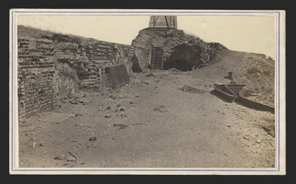 two sitting on a huge camera(!) and reads in pen on verso, VFort Sumter: Photographs Four scarce carte-de-visite Photographs, two by H.C. Foster of Morris Island/Charleston, SC, as identified in print on back. One shows men in foreground, two sitting on a huge camera(!) and reads in pen on verso, "View...showing the effects of Union knocks at the door," while the other is an "Interior view of Fort Sumter showing the effects of our fire." The other pair is printed by E. Anthony of NY from a Brady negative of soldiers and others posing at post-siege batteries of Ft. Sumter, and by E & A Anthony of a broken cannon in rubble at the fort's base. All are VG. [4] (imagea) (imageb) (imagec) (Image) Est. $1,000-1,200