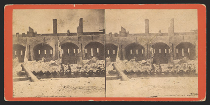 Sumter as identified on verso as after the evacuation by Major AnFort Sumter: Stereo Views Three stereoscopic Photographs, one each by G.N. Barnard and Osborn & Durbec, both of Charleston, and one uncredited, showing the interior of Ft. Sumter as identified on verso as ""after the evacuation by Major Anderson in 1861," with remains of the flagstaff; cannons lined up within the walls of the fort; and the fort's sea face from outside, showing the lighthouse. All with some light edge wear, soiling, but VG. [3] (imagea) (imageb) (Image) Est. $400-500