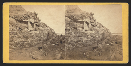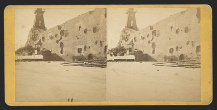 from a series. All with full descriptions on verso, showing respFort Sumter: Stereo Views IV Choice quartet of stereoscopic Photographs, early post-war, published by T. Souder (2) and Quinby & Co (2) of Charleston, numbers 29, 31, 35, and 38 from a series. All with full descriptions on verso, showing respectively the South Angle after the war; a close-up of the same, showing a porthole; the interior of the Northeast Angle, as taken by Gen Anderson, showing Gen Wade Hampton and Bishop Lynch; and the fort's eastern face, showing the lighthouse. All are lightly soiled with minor edge rubbing, VG. [4] (imagea) (imageb) (imagec) (Image) Est. $750-1,000