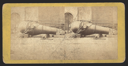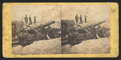 descriptions on versos. Anthonys, 1267 in a series, shows TFort Sumter: Stereo Views III Four choice stereoscopic Photographs printed by E & HT Anthony of NYC and John C. Taylor of Hartford, CT (2), with one uncredited, all with printed descriptions on versos. Anthony's, #1267 in a series, shows "The Swamp Angel...with which Gen. Gilmore threw the first shot into Charleston" taken at Brooklyn Navy Yard. Anthony's, #52 and #73 in his War Views series, show the "first 300 pound Parrott gun" that fired on Sumter; and a mortar battery with soldiers on Morris Island. The last one shows a 200-pound Parrott at Ft. Wagner. Anthonys with some bumping at corners of mounts, all with edge wear and soiling, but all VG. [4] (imagea) (imageb) (imagec) (Image) Est. $600-750