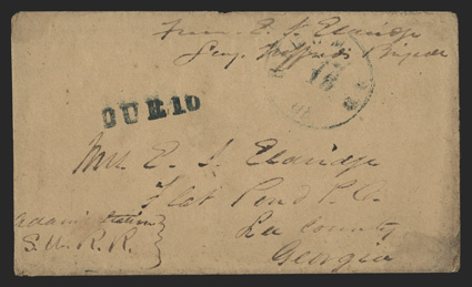 Pond, Georgia: Of the success of the battle...I need noChancellorsville: CSA Surgeon's Letter Excellent content ALS by Erwin J. Eldridge of William T. Wofford's Brigade, 4 pages, 4to, ""Camp,"" May 12, 1863. He writes to his wife in Flat Pond, Georgia: ""Of the success of the battle...I need not tell you...The loss in our brigade was quite heavy - about five hundred & fifty killed and wounded - so you can imagine I was pretty busy. After getting entirely through with our wounded some of us went to a church filled with Yankee wounded and as they had but one Surgeon and he a fool we took charge and operated on several of them. I scratched my hand slightly and though nothing of it. On Friday evening I took out the elbow joint of a little New Yorker...and his arm being very much swollen and in a very bad condition I suppose some of the blood got into my wound and sooon afterward I woke up with the most intense pain...My hadn and arm were very much swollen...I was a little alarmed, too, as loss of limb and life are not uncommon results of such accidents...It is now so near well as to relieve me of all danger...Col. [Goode] Bryan was struck, the ball passing through the breast pocket of his coat where he had his spectacles, some letters, papers, etc. - going through them and his clothes but cutting through the skin - quite a painful wound - His breast was quite swollen and painful and he fears an abscess will form...I met several surgeons from across the river...We found that some of them were at college the same time we were. Some of them were pleasant gentlemen, some hogs. I never saw such perfect indifference to their men as they showed. They seemed not to care whether they lived or died..." With original Postal Cover, bearing Richmond postmark and stamp "Due 10." (imagea) (Image) Est. $500-750