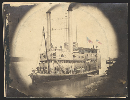 paddle-wheel boat at Mound City, IL for repairs. The other pVicksburg: USS Switzerland Four war-date Photographs, two of them cartes-de-visite; the other pair panel photographs of 8"" x 11"" and 6.5"" x 8.4"". The largest shows the converted paddle-wheel boat at Mound City, IL for repairs. The other panel image is vignetted from a visibly broken glass plate, showing the boat near shore, flying two hand-tinted American flags. On verso is a pen description Col Charles Ellet's last hours on the ship after the Battle of Memphis, where he received mortal wounds. Ellet was the principal designer of the US "Ram Fleet." The cartes-de-visite, both printed by Charles Pfetsch of New Albany, IN, show an engraving of the boat and a repeat of the broken-plate image. Both of these have proprietary revenue stamps on versos. All are lightly toned, the large photographs also with some edge nicks and wear, but the group is VG. With three small related newsprint engravings. [4] (imagea) (Image) Est. $200-300