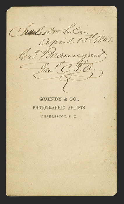 brigadier general in March 1861 commanded forces at Charleston, ,Beauregard, Pierre G. T. American soldier and politician (1818-93); began as an engineer in the US Army, serving with distinction in the Mexican War; became the first Confederate brigadier general in March 1861; commanded forces at Charleston, , ordering the bombardment of Fort Sumter on April 12, 1861, initiating the Civil War; helped design the Confederate Battle Flag that has come to be a symbol of the South; his record as a field commander was mixed, and his poor relationship with Jefferson Davis and with his colleagues kept him from maintaining prominence in the Confederate Army. Amazing date carte-de-visite Photograph Signed on verso "Charleston So. Ca. / April 13th 1861 / G.T. Beauregard / Genl. CSA," a thigh-length image of the general in uniform with his arms crossed, by Quinby & Co of Charleston, as identified in print on verso. Image is somewhat faded, with top right corner clipped, usual toning and soiling, but overall VG, with the signature in particular extremely sharp and fine. On April 13, 1861, after over 32 hours of shelling, Ft. Sumter's flag was knocked down by a cannonball. Soon after, negotiations began with Major Robert Anderson, the fort's commander, for its surrender. Anderson's men had withstood over 3,000 rounds of Confederate fire without a single fatality, but fires were burning out of control and food and other supplies were dwindling. Not until the following day was the fort formally surrendered, and during Sumter's 100-gun evacuation salute, a Union soldier was killed by a misfiring gun - the first casualty of the war. General Beauregard signed this photograph at the time of his greatest victory, the moment that would earn him an immortal place in American history! (imagea) (Image) Est. $2,500-3,000