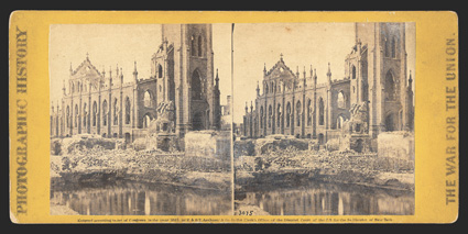 3077, and 3442, showing, respectively, ruins of the Catholic cathedCharleston: Stereo Views Trio of stereoscopic Photographs of Charleston, SC, all printed by E & HT Anthony of NYC, one from a Brady negative, parts of a series, numbers 3075, 3077, and 3442, showing, respectively, ruins of the Catholic cathedral; ruins of the Central Hall; and the Circular Hall and ruins of Secession Hall. Some foxing, all with minor edge wear and soiling, but overall VG. (imagea) (imageb) (Image) Est. $300-400