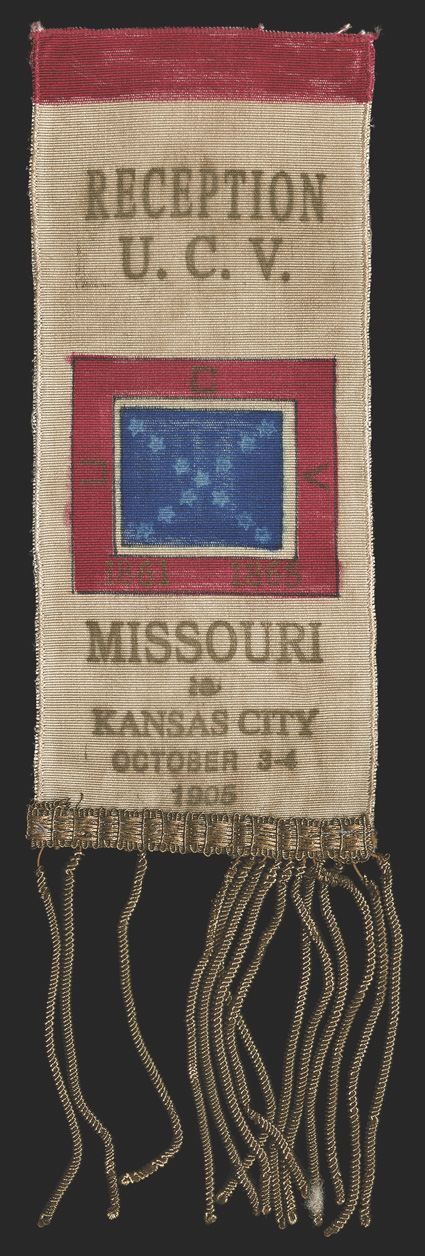 at bottom, for the 1905 UCV reception at Kansas City, October 3-Confederate Veterans: 1905 Reunion Great pair of items from a meeting of United Confederate Veterans in Missouri. A ca 10"" red, white, and blue Ribbon with gold-colored tassels at bottom, for the 1905 UCV reception at Kansas City, October 3-4. Apparently hand-colored, with UCV flag-like emblem at center. A number of tassel strands are gone. With 5.5" x 7.75" "Stainless Banner" Flag with white field and red and blue Southern cross canton, with the place and date of the reunion in gold letters on field. In VG/F condition for an item of its age. (imagea) (Image) Est. $400-500