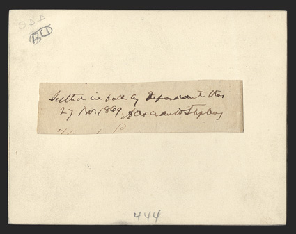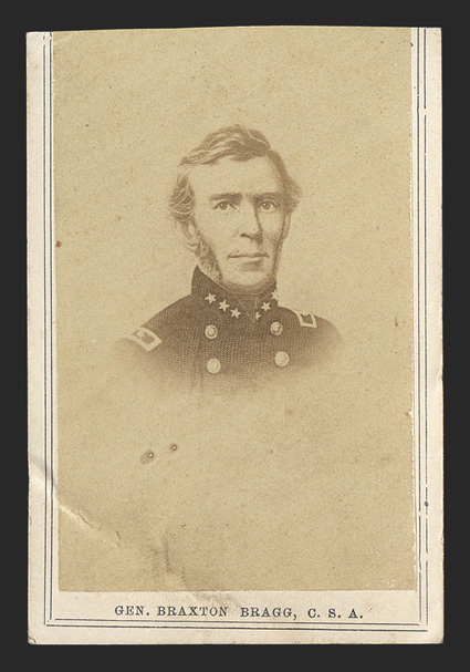 Richmond, February 4, 1862. He sends regrets to William GravesCSA Collection A small but interesting group, including Letter Signed by ""S.R. Mallory / Secretary of the Navy,"" 1 page and one line, 4to, on official imprinted stationery, Richmond, February 4, 1862. He sends regrets to William Graves of Norfolk for delays in payment on his contract, "caused by the want of Treasury notes which cannot be printed and signed fast enough to meet the demand," which should permit payment in a few days. Extensive staining from prior tape repairs at splits, affecting signature. With clipped Signature of CSA Vice President "Alexander W. Stephens," his autograph confirmation that a debt has been "settled in full...27 Nov. 1869." On a .8" x 3.25" sheet, tipped to a 12mo card. With pair of carte-de-visite Photographs identified in print on mounts as "Gen. Braxton Bragg, CSA" and Gen. James Longstreet, CSA." Longstreet's is a photographic image from an engraving. Both clipped a bit at top, crease in Bragg, but both VG. With two 1864 CSA $10 Banknotes, T-68, one well circulated. [6] (imagea) (imageb) (Image) Est. $300-400