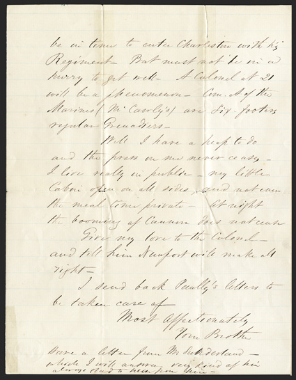 fire commanded the Washington Navy Yard early in the Civil War lateDahlgren, John A American naval officer and inventor (1809-70); known as the father of modern naval ordnance, he developed naval howitzers and shell guns suited for long-range fire; commanded the Washington Navy Yard early in the Civil War; later led the South Atlantic Blockading Squadron. Good personal and war content Autograph Letter Signed "Most Affectionately / Your Brother," 2 pages on separate sheets, "Off Morris Is.," August 10, [1863]. He writes his sister Patty, "Our worst enemy here is the climate. Officers and men break down daily and have to be sent away...Charley ought not to come before Octr. The work will be tedious and done step by step. The Confds are now plainly preparing the second step for us - as if they admitted the fall of Sumter. In a few days we resume, and the cannonade will exceed any previous. I have a Regiment of Marines and also a Battery in the trenches manned by Sailors. Afloat we shall be in full fig. Tell Ully [his son, Ulric Dahlgren]he will yet be in time to enter Charleston with his Regiment - But must not be in a hurry to get well. A Colonel at 21 will be a phenomenon. Com A of the Marines (McCawly's) are six-footers, regular Grenadiers...Give my love to the Colonel and tell him Newport will make all right." Minor closed tear at fold of second page, otherwise VG. Ulric Dahlgren had lost his foot in a daring raid on July 6; he was subsequently named a colonel, skipping over the rank of major. He would be killed in March 1864 while on another infamous raid with the dual aims of releasing prisoners of war in Richmond and assassinating Jefferson Davis! The latter order was convincingly disavowed by the Union high command, but not so convincingly by Col Dahlgren's chief, Gen Judson Kilpatrick, who had sent him on the raid. Admiral Dahlgren's other comments concern the ongoing assault on Charleston, which had climaxed in a disastrous assault on Fort Wagner in July. The city was never captured from the sea. (imagea) (Image) Est. $1,000-1,500