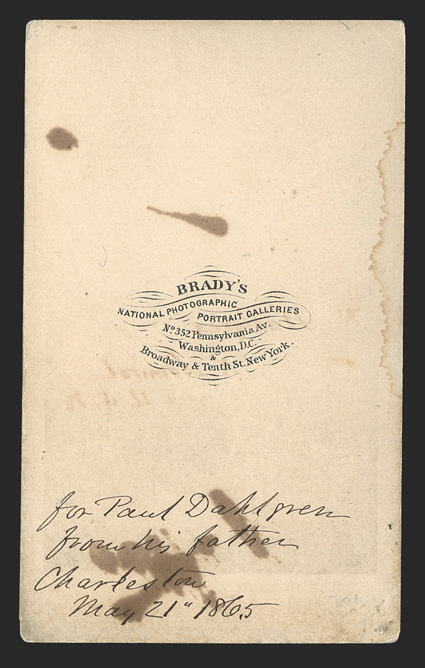 1865. A striking full-length image in uniform asDahlgren John A Outstanding war era carte-de-visite Photograph Signed on verso as ""Father"" and inscribed there in full, ""For Paul Dahlgren / from his father / Charleston / May 21"" 1865."" A striking full-length image in uniform as rear admiral in front of one of the guns he designed, printed by Matthew Brady's studio, identified in print on verso. With inscription (in another hand) on recto "Off Charleston - 1865." Staining on verso affecting signature and most of inscription, but fully legible. Otherwise VG. (imagea) (Image) Est. $1,000-1,500