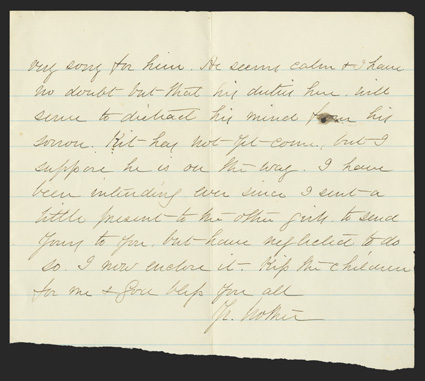 to be one of only three men without prewar experience named lieutenanHampton, Wade American politician and Confederate cavalry commander (1818-1902); son of one of Charleston's leading families, his daring exploits as a cavalry commander led him to be one of only three men without prewar experience named lieutenant generals in the CS Army; after the war, became Governor and US Senator from SC, helping signal the end of Reconstruction. Fine content Autograph Letter Signed "Yr Brother," 2-1/2 pages, 8vo, Martinsburg, [WV], October 5, 1862. Writing to his sister, Mary Hampton Fisher, he thanks God that the family is all well, since "Death has often been very near to us...I can scarcely realize that all of us who came into this war fifteen months ago are still safe & well. When I look back over the battlefields of that long time & remember the thousands who lie there now, my heart is deeply thankful for that mercy which has spared me & mine. I pray that we may still be spared, but if this is not to be, I pray that I may be able to discharge my duty faithfully...My heart has grown sick of this war & I long for peace. If it does not come this winter, there is no saying when we may look for it. As long as the madness of the Yankees continues so long will this fearful war...The Yankees will not attack us here & I suppose we shall have to move off before very long. [Hampton's brother] Frank has taken his position as Lt. Col. Poor fellow...He seems calm & I have no doubt but that his duties here will serve to distract his mind from his sorrow. Kit [Hampton's other brother, Christopher]has not yet come, but I suppose he is on the way..." Bottom half of last page torn away, but letter complete. Age-toned, but VG. Frank Hampton would not survive the war, dying under Wade's command at Brandy Station in June 1863, the largest cavalry battle to ever occur on American soil. Wade Hampton would also lose one of his sons in a war where few could boast that divine mercy spared them and theirs. Just a few days after this letter, Hampton would join JEB Stuart in an infamous raid on Chambersburg, PA. An outstanding content letter showing Hampton's faith, commitment to duty, and love of family. (imagea) (Image) Est. $1,500-2,000