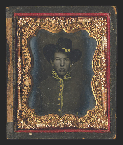 with tinted cheeks and buttons. With a 4.25 x 3.25 TintPhotography: Collection Six images, five of them from the Civil War era. Includes a choice pair of 3"" x 2.5"" Ambrotypes in a dual case, each showing a man in a war-era shell coat with tinted cheeks and buttons. With a 4.25"" x 3.25"" Tintype of the same pair seated together. Also with a 2.5" x 2.1" Tintype of a youth in a shell jacket, kepi, and eagle-buckled belt, holding a pistol! His buttons, belt, and ring have been tinted gold. With another 2.5" x 2.1" Tintype of a young trooper in a jaunty cavalry-style hat, his hat tassel, buttons, and uniform braid tinted gold. Finally, with a cabinet card Photograph of a meeting of the John Anderson post of the Grand Army of the Republic, ca. 1890. Seventeen veterans pose with their post's flag. This post, in Wilder, KS, is in a region once raided by Quantrill's partisans. It is now part of the Kansas City suburbs. A choice group, all at least VG. (imagea) (imageb) (Image) Est. $300-400