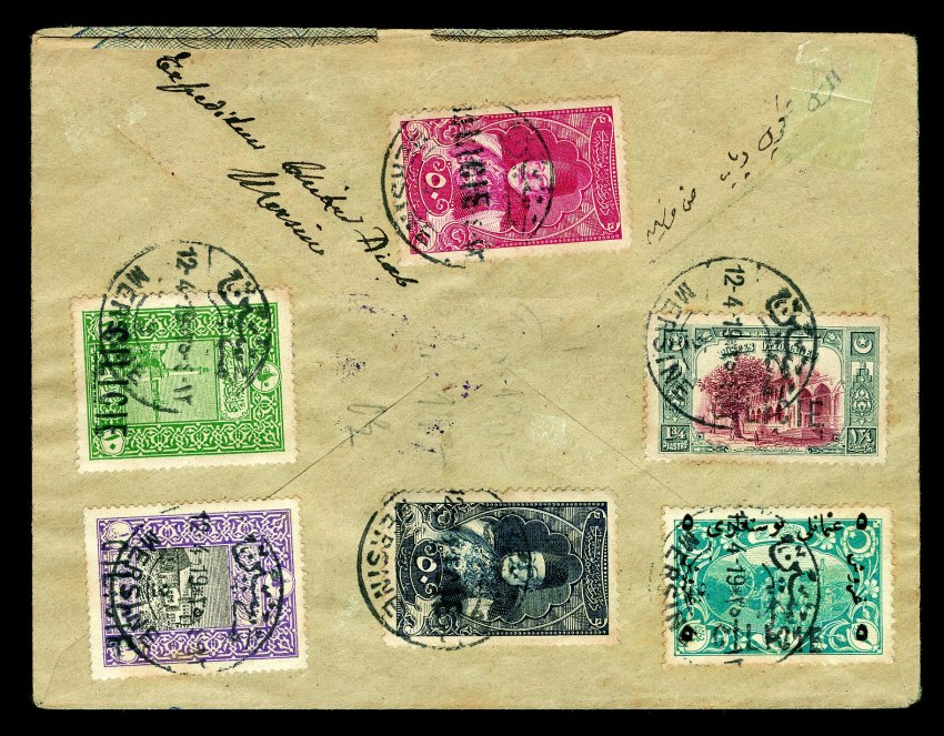 303 c Yvert #1/20 ImageYvert #1/20, 5pa-50pi First overprints, fourteen different values tied by Mersine 12.4.19 c.d.s. postmarks to the front and the back of a cover to Beirut, Syria, with violet oval "PASSE A LA CENSURE" handstamp, cover has trivial crease at left not affecting any of the stamps, fine; while overfranked, it is still a most unusual usage that did postal duty. (imagea) (Image) Est. $200-300