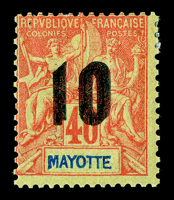828 c Maury #(5) ImageMaury #(5), French Colonies 1859 40c Orange on yellowish, single with large to huge margins all around, tied by perfectly struck "Mayotte et Dep., Mayotte/10 Sept. 77" datestamp to folded cover to France, postmark repeated at left, "via Brindisi" directive and red transit postmark, cover with bottom portion of address panel missing, very fine and rare usage (Scott French Colonies #5). (Image) €4,250