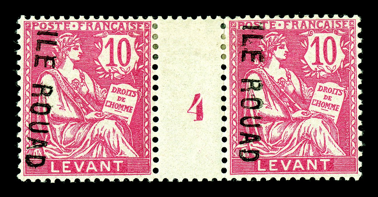 1015 og Yvert #2-3 ImageYvert #2-3, 1916 "ILE ROUAD" Overprints on 10c Rose red and on "1 PIASTRE 1" on 25c Blue, very rare mint horizontal gutter pairs with millesimes "4" and "2", the 10c with inverted surcharge reading down, well centered for these, fresh and intact, o.g., h.r., very fine; only 1,200 of each were overprinted; first signed Calves and the other signed A. Brun and Roumet (Scott #2-3; $2,000.00 for singles). (imagea) (Image) €2,300