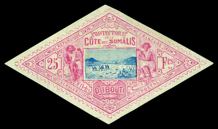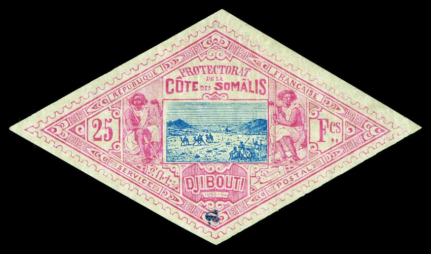 1062 og Yvert #2 ImageYvert #2, 1894 "25" Surcharge and blue diagonal "DJIBOUTI" overprint on 2c Brown on buff, fresh and well centered, o.g., h.r., very fine (Scott #2; $375.00). (Image) €475