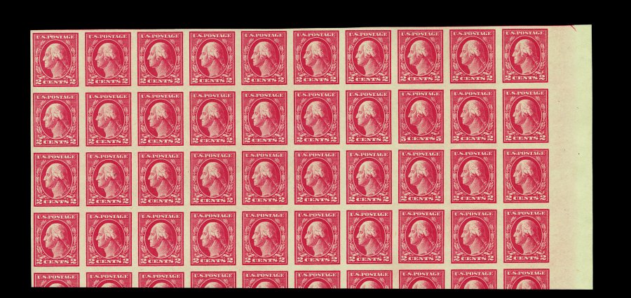 582 nhbl 485 image#485, 5c Carmine error imperforate, single error in a marvelous complete bottom right pane of 100, with full sheet selvages showing plate no. 7942 both at right and at bottom, wonderfully bright and fresh, lovely rich color, pristine o.g., n.h., extremely fine; a fabulous showpiece example of one of the great rarities of 20th century U.S. philately; signed H. Bloch in corner sheet selvage. (image 582a) (Image) 25,000.00+