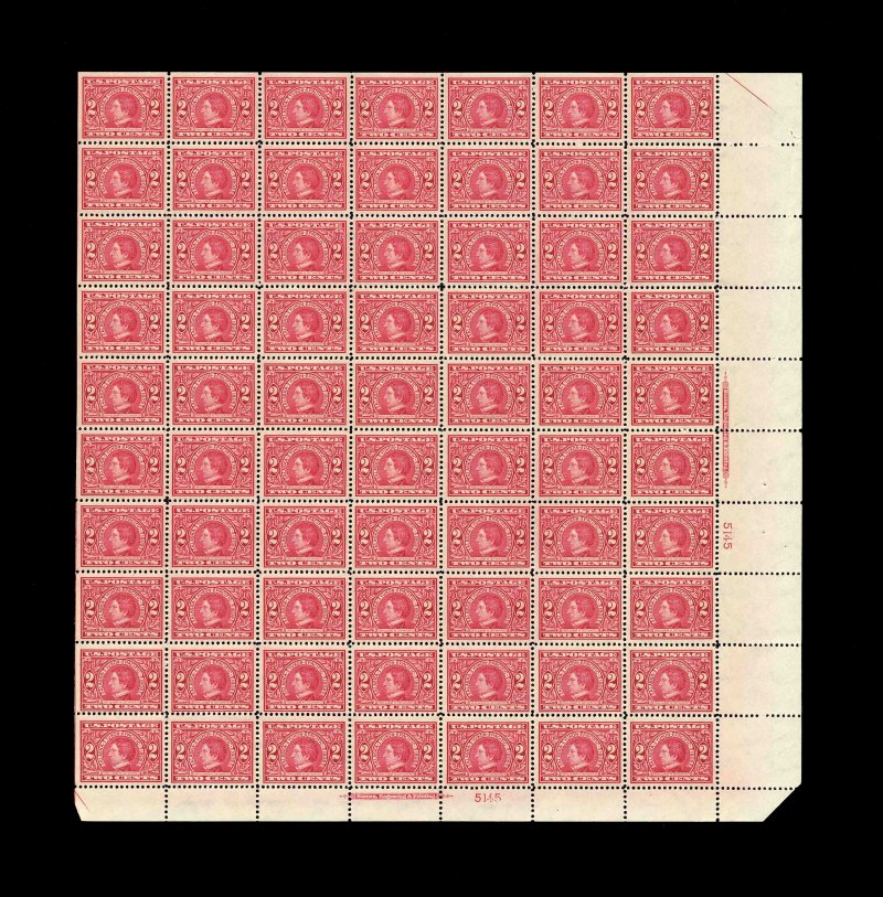 561 nhbl 370 #370, 2c Alaska-Yukon, bottom right plate no. 5145 pane of 70, rich color, crisp and intact, rather well centered throughout, the third column of stamps contains some gems, o.g., n.h., trivial selvage tear at top right, very fine. (Image) 1,490.00+