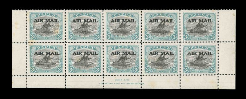 1625 nhbl C1 var. #C1 var., 1929 3p Blue green and dark gray on white paper, Ash printing, "Air Mail" overprint doubled, mint block of ten representing the bottom two rows of the sheet with full margins and imprint, with the two overprints being closely spaced, o.g., the stamps are n.h., light toned spots, otherwise very fine; a much sought-after rarity as only one sheet of forty was printed with this error; 1956 and 2002 PF certificates (S.G. #114 var.; Sanabria #3a). (Image) Est. 1,000-1,500