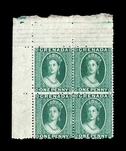234 nhbl S.G. #19 S.G. #19, 1881 1p Green on thin paper, rough perf. 14 1/2, wmk. sideways small star, a lovely top left corner-margin block of four, bright clean color, quite well centered, o.g., stamps n.h. just being lightly hinged in the selvedge, very fine-extremely fine; ex-Pilkington and Schneider (Scott not specifically listed, #5B var.). (Image) £480+