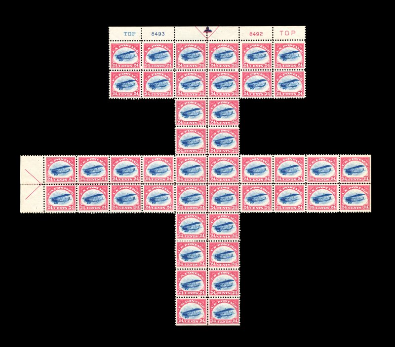 1554 ogPB C3 #C3, 24c Carmine rose and blue, irregular top margin arrow, two "TOP" and plate nos. 8493, 8492 block of 42, with two full vertical center rows and two full horizontal center rows meeting at the center line block, o.g., one stamp in plate block and six others (including four with s.e.) are hinged, other 35 stamps never hinged, usual natural gum bends at top, a very fine and eye-catching item; cataloged as singles. (Image) 5,460.00+