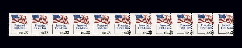 1061 nh 2605 var. image#2605 var., 23c Flag, Bureau pre-cancel coil, imperforate, five imperforate stamp contained in a strip of eleven, with the other six stamp misperforated, o.g., n.h., left two stamps with light horizontal crease, very fine; this is the only example we have seen of this error in any form, and could very well be a unique coil imperforate error; unlisted in Scott and Datz. (imagea) (Image) Est. 4,000-5,000
