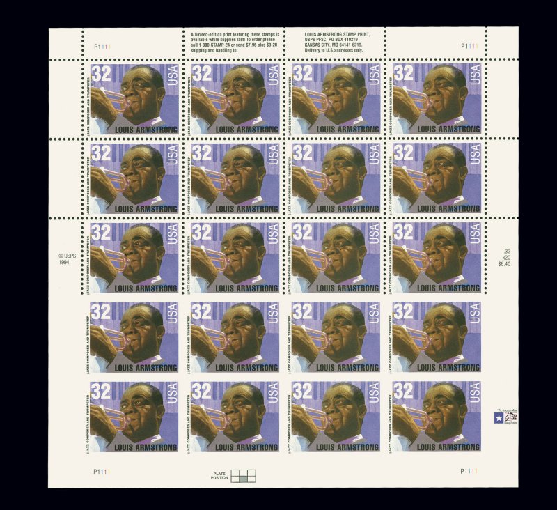 1070 nhbl 2982 var. image#2982 var., 32c Louis Armstrong, imperforate, four imperforate pairs in a transitional pane of twenty, the errors being the bottom two rows, o.g., n.h., very fine; this is a unique pane and represents all of the known imperforate stamps of this issue; not yet listed in Scott or Datz. (imagea) (Image) Est. 5,000-7,500
