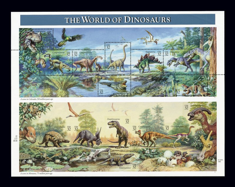 1076 nhbl 3136p image#3136p, 32c World of Dinosaurs pane of fifteen, bottom seven stamps imperforate, the unique example of this stunning error, o.g., n.h., extremely fine; quite undervalued in Scott, as the catalog value is based on the last recorded public sale in March 2003, the relatively low realization probably based in the first time it being offered, no one knew if other examples were still out there, but since that time no other examples have surfaced, leaving little doubt that this will be one of the key modern error rarities to acquire; ex-Floyd. (imagea) (Image) $3,000.00