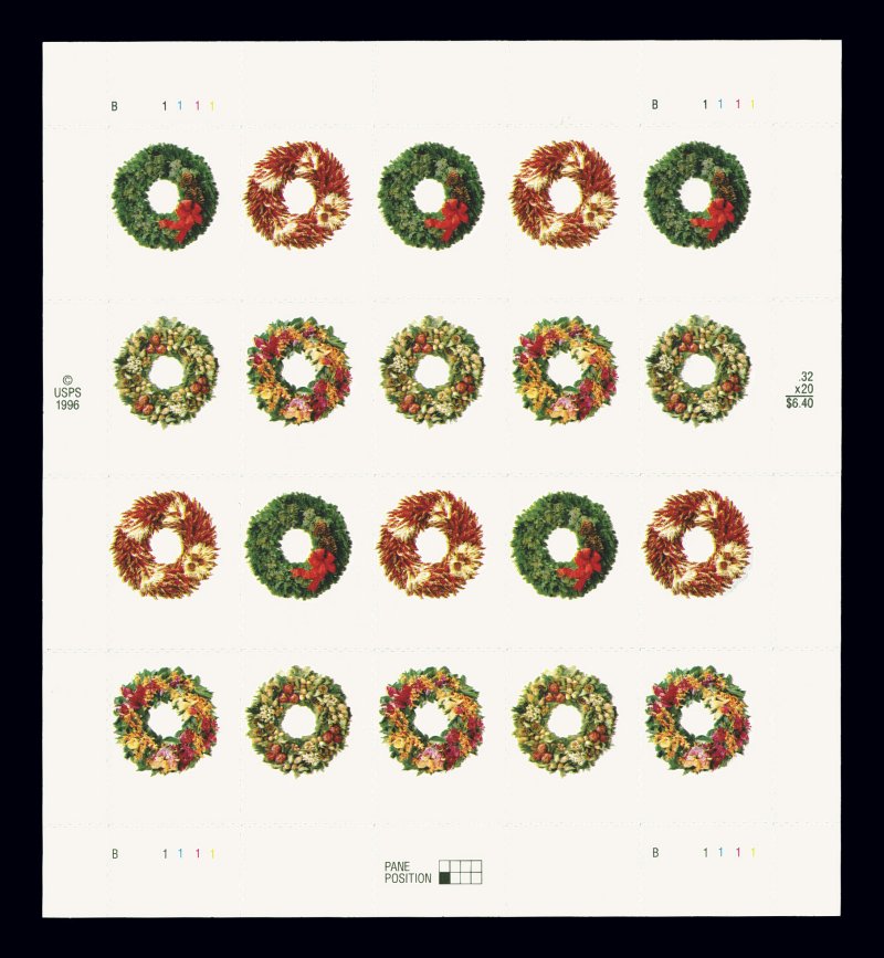 1077 nhbl 3252b var. image#3252b var., 32c Wreaths, se-tenant block of four, red and green omitted, pane of twenty showing the denomination and salutation missing in red ("a" and "d") or green ("b" and "c"), with original backing, very fine; while the red omitted variety (#3252f) is known on two panes, this pane represents the only examples of the green omitted error known. (imagea) (Image) Est. 5,000-7,500