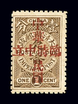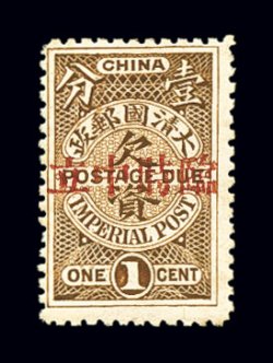 1691 ng Chan #DU1 imageChan #DU1, 1911 1/2c Brown postage due, unissued value, unused, without gum, beautifully centered, brilliant orange brown color, extremely fine and exceptionally rare; in 1911 a new order was made with Waterlow for six values of postage dues with the instruction to change the color from blue to brown, the 1c and 2c values in brown arrived first and were issued, the 1/2c, 4c, 5c and 20c did not arrive until after the Manchu government had been overthrown and the Republic instituted, these four values were immediately issued with Republic of China overprints, only a very few unoverprinted stamps found their way into collectors' hands making them exceedingly elusive and seldom offered; listed but not priced in Chan, not listed in Scott but mentioned in a footnote after #J16. (Image) Est. 400-500