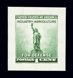 1252 E 899-E image#899-E, 1c National Defense, large die essay on wove paper, die sunk on large card measuring 140x162mm, a nearly completed engraving lacking the cross hatching in the shading of the background, plus there are some light horizontal lines in the white areas of the "For Defense" inscription that have not yet been cleaned out, quite fresh and very attractive, tiny spot of toning to the card at left, choice very fine; an unlisted essay not found in either Scott or Brazer, however a die proof on India is listed and since the other two values exist as engraver's proofs it is possible that this does also, but when this was recently purchased it was described as a die proof on India in the auction description, therefore it is conceivable that the regular die proof does not exist; certainly unique as an essay and a wonderful new discovery; W.A. Roach, designer; Carl T. Arlt, vignette engraver. (Image) Est. 1,000-1,500