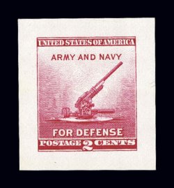 1253 P 900P1a image#900P1a, 2c National Defense, large die proof on wove paper, die sunk on full size card measuring 152x202mm, an exceptionally attractive die proof being very fresh and in excellent condition, Bureau handstamp on the reverse reads "Engraver's Stock Proof/Authorized by" and initialed, "Rollins", the vignette engraver penciled at bottom, extremely fine; a die proof is listed by Scott on India but not on wove, our experience tells us that this is probably the listing proof; certainly an exceedingly rare proof and it is quite likely that this is the only example in private hands; W.A. Roach, designer; H.R. Rollins, vignette engraver; control number 656511A (1940). (Image) Est. 1,000-1,500