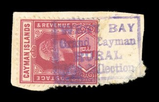 2368 c image"Rural Post/Collection/Grand Cayman" violet boxed handstamp, Type RP1, handsome complete strike tying 1912 1/2p Green (S.G. #41) to neat domestic cover to Georgetown, "Georgetown/Grand Cayman/MY 31 13" c.d.s. receiving pmk., Type 5, minor cover scuff at top of cover, not affecting stamp or markings, actually exceptionally clean and attractive, very fine; it is believed this canceller was lost during a hurricane in 1917, but the latest recorded usage is this May 31, 1913 date (Scott #33). (Image) Est. 1,000-1,500