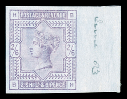 160 P 175 imp. imageS.G. #175 imprimatur (S.G. Spec. #K9 imp.), 1883 2/6p Lilac on blued paper, imperforate, CB, exceptionally wide and even margins all around, fresh color, o.g., small paper flaw by Queen's chin, otherwise very fine and rare; 1996 BPA certificate; ex-Dr. Douglas Latto (Scott #96a imprimatur). (Image) £3,000
