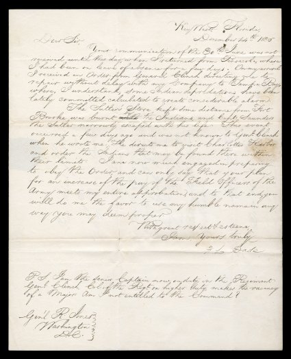 1200 c imageCaptain Francis L. Dade, autographed letter signed, entire letter to General R. Jones in Washington, D.C., "Key-West/Florida/Dec 15" red oval of Florida Territory with matching "Free" handstamp at right, very fine; in this letter, datelined "Key West, Florida/December 14th 1835", Captain Francis L. Dade responds to General Jones communication of two weeks previous, which he did not immediately receive because Dade had been on leave in Pensacola, he informs General Jones that he has "...received orders from General Clinch directing me to repair without delay with my Company to Tampa Bay where, I understand, some Indian depredations have been lately committed calculated to create considerable alarm", Captain Dade goes on to describe a recent attack on Sutler's Store near Fort Brooke and concludes with "I am now much engaged in preparing to obey the order...", in a postscript he inquires that since he is now the senior Captain in the regiment, if he is not entitled to the rank of Major in command of the regiment.This letter sets the stage for one of the most notorious Indian massacres that the army had to date experienced and would not be played out again until 40 years later at the Little Big Horn in Montana. Captain Dade, with a company of 102 men and eight officers were ambushed two weeks later on December 28th by 180 Seminole Indians, besides a large number of negro slaves. Captain Dade was killed and the entire command was virtually annihilated with only three soldiers surviving. Thus starts the second Seminole war of 1835-42, which was to become one of the longest, bloodiest and most costly engagements with Indians in the history of the United States. Captain Dade is recognized as a military hero and, among other honors, Dade County is named after him. He was also posthumously given the rank of Major that he had requested. This letter is not only highly significant in its content and relationship to this event (It may have been his last correspondence, a theme that Gordon Bleuler used to write a fictional article on the event), but it is one of the very few autographs or artifacts that have survived of this military hero. This letter is a great Florida Territory and Indian related rarity without equal; ex-Bleuler. (imagea) (Image) Est. $4,000-5,000